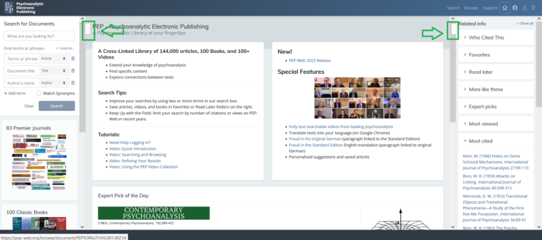 First, make sure you have all three panels open on the PEP-Web homepage. The side panels to the left and right can be opened or closed using the small arrow tabs on their margins at the top: