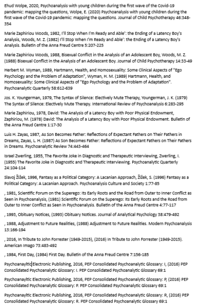 A 20MB file of bibliographic data for the articles that appear in PEP-Web is available to subscribers in REFER format, which can be imported into EndNote and other bibliography managers. The list is refreshed within 30 days after each major release of PEP (e.g., A1v9, A1v10, etc.) To request access to the .refer file containing the full bibliography, please use the “Provide Feedback” form, accessed by clicking on the Help icon “?” on the main PEP-Web toolbar and selecting “Provide Feedback”. You must have a PEP-Web subscription to request the full bibliography.