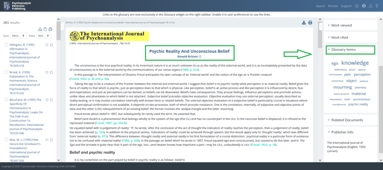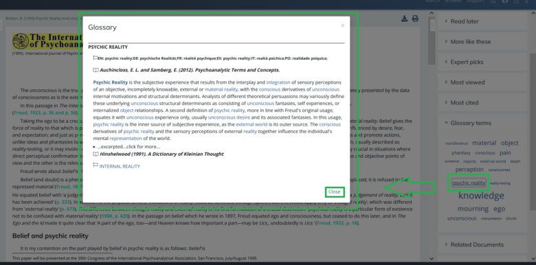 Next, search for an article, and open the article fully in the central reading panel. Then look to the right side panel and open the ‘Info Card’ called ‘Glossary terms’. Click on the ‘Info card’ to open it. You will see a selection of glossary terms used in the article. Click on a ‘term’ to open the relevant entry in the PEP consolidated glossary. The glossary entry will open as a pop-up, click ‘Close’ after reading to return to the article: