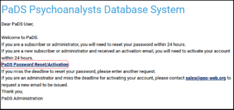 - You will receive an email from sales@psychoanalyistsdatabase.com containing a highlighted link entitled PaDS Password Reset/Activation. Click on this link, as shown below: