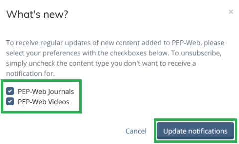 New content updates will be sent to the email address registered to your PEP-Web account. To check which email address this is, on the homepage, click on the “Person” icon on the main top toolbar (top right) and a dropdown menu will appear entitled “Preferences”. Displayed in this menu is the email address that notifications will be sent to.