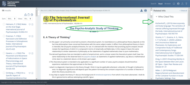 On the homepage: https://pep-web.org/ in the right-hand side panel there is a new ‘Info Card’ labelled ‘Who Cited This’:
